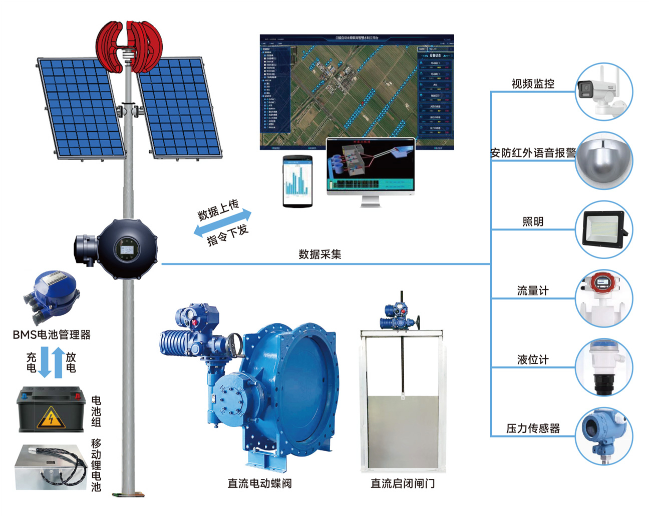 由太陽能光伏板和小型風力發(fā)電機為蓄能電池組充電,電池組有BMS電池管理軟件管控,為永磁無刷直流電機的各類驅(qū)動裝置供電,同時為視頻監(jiān)控,壓力、流量、液位傳感器,照明等供電